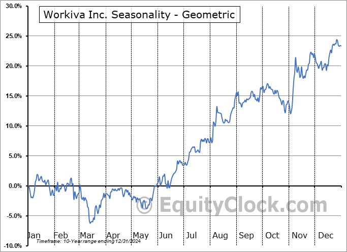 Analysis of the Workiva Inc. (NYSE:WK) seasonal charts above shows that a Buy Date of June 11 and a Sell Date of September 30 has resulted in a geometric average return of 14.52% above the benchmark rate of the S&P 500 Total Return Index over the past 10 years. This seasonal timeframe has shown positive results compared to the benchmark in 9 of those periods. This is an excellent rate of success and the return strongly outperforms the relative buy-and-hold performance of the stock over the past 10 years by an average of 5.49% per year.