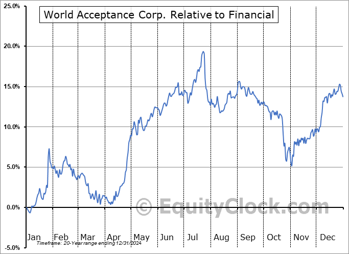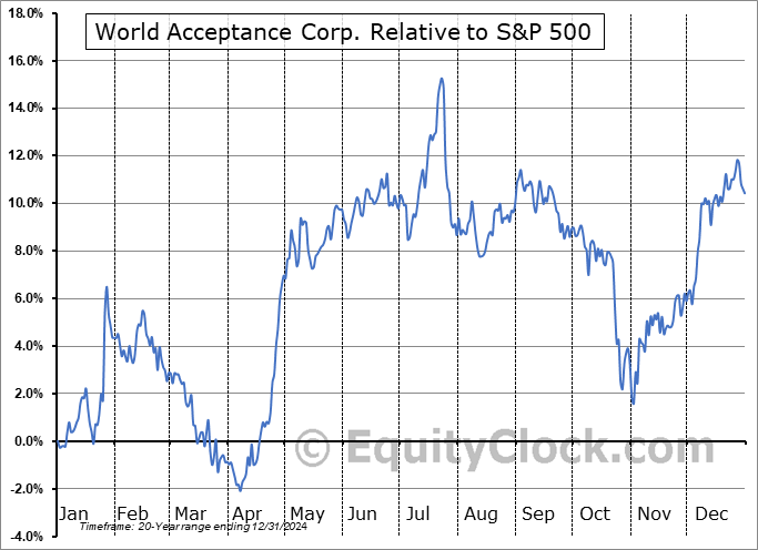 Analysis of the World Acceptance Corp. (NASD:WRLD) seasonal charts above shows that a Buy Date of April 8 and a Sell Date of August 19 has resulted in a geometric average return of 4.93% above the benchmark rate of the S&P 500 Total Return Index over the past 20 years. This seasonal timeframe has shown positive results compared to the benchmark in 16 of those periods. This is a very good rate of success and the return strongly outperforms the relative buy-and-hold performance of the stock over the past 20 years by an average of 7.51% per year.
