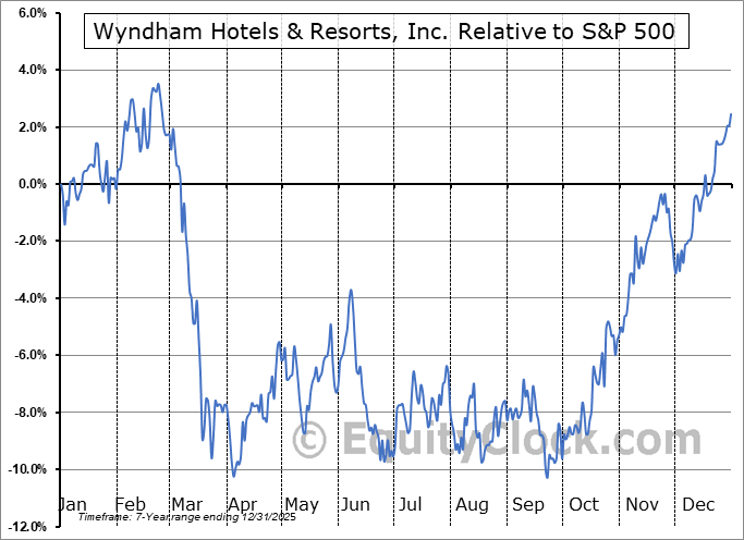 Analysis of the Wyndham Hotels & Resorts, Inc. (NYSE:WH) seasonal charts above shows that a Buy Date of August 21 and a Sell Date of January 1 has resulted in a geometric average return of 13.12% above the benchmark rate of the S&P 500 Total Return Index over the past 6 years. This seasonal timeframe has shown positive results compared to the benchmark in 6 of those periods. This is an excellent rate of success and the return strongly outperforms the relative buy-and-hold performance of the stock over the past 6 years by an average of 13.89% per year.
