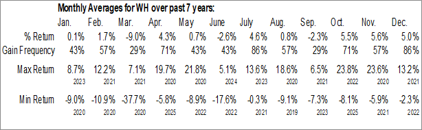 A word of caution: Only 6 years of data is available for shares of WH, perhaps insufficient to create a seasonal profile that accurately gauges the seasonal tendencies influencing the investment. Ideally, while 20 years is preferred, at least 10 years of data is required to perform a seasonal analysis that is considered to be reliable for future seasonal periods.