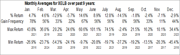 A word of caution: Only 9 years of data is available for shares of XELB, perhaps insufficient to create a seasonal profile that accurately gauges the seasonal tendencies influencing the investment. Ideally, while 20 years is preferred, at least 10 years of data is required to perform a seasonal analysis that is considered to be reliable for future seasonal periods.