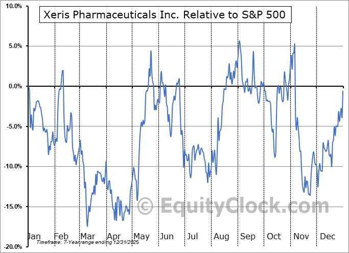 Analysis of the Xeris Pharmaceuticals Inc. (NASD:XERS) seasonal charts above shows that a Buy Date of April 19 and a Sell Date of July 11 has resulted in a geometric average return of 9.86% above the benchmark rate of the S&P 500 Total Return Index over the past 6 years. This seasonal timeframe has shown positive results compared to the benchmark in 5 of those periods. This is a very good rate of success and the return strongly outperforms the relative buy-and-hold performance of the stock over the past 6 years by an average of 44.72% per year.