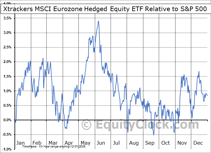 Analysis of the Xtrackers MSCI Eurozone Hedged Equity ETF (AMEX:DBEZ) seasonal charts above shows that a Buy Date of February 14 and a Sell Date of May 21 has resulted in a geometric average return of 2.03% above the benchmark rate of the S&P 500 Total Return Index over the past 10 years. This seasonal timeframe has shown positive results compared to the benchmark in 9 of those periods. This is an excellent rate of success and the return strongly outperforms the relative buy-and-hold performance of the stock over the past 10 years by an average of 5.76% per year.