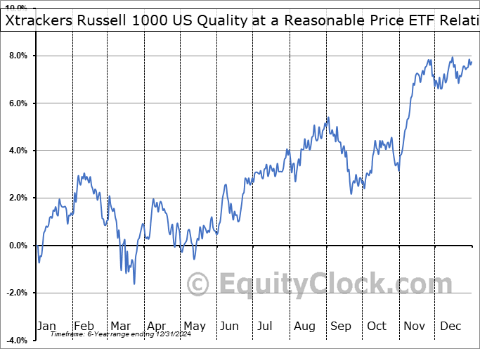 Analysis of the Xtrackers Russell 1000 US Quality at a Reasonable Price ETF (AMEX:QARP) seasonal charts above shows that a Buy Date of July 9 and a Sell Date of November 14 has resulted in a geometric average return of 0.69% above the benchmark rate of the S&P 500 Total Return Index over the past 6 years. This seasonal timeframe has shown positive results compared to the benchmark in 5 of those periods. This is a very good rate of success and the return outperforms the relative buy-and-hold performance of the stock over the past 6 years by an average of 1.49% per year.