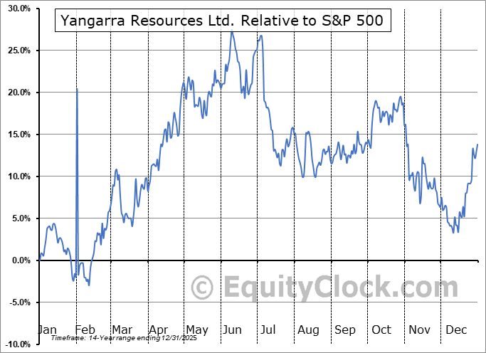 Analysis of the Yangarra Resources Ltd. (OTCMKT:YGRAF) seasonal charts above shows that a Buy Date of March 17 and a Sell Date of June 11 has resulted in a geometric average return of 14.75% above the benchmark rate of the S&P 500 Total Return Index over the past 14 years. This seasonal timeframe has shown positive results compared to the benchmark in 10 of those periods. This is a good rate of success and the return strongly outperforms the relative buy-and-hold performance of the stock over the past 14 years by an average of 32.54% per year.
