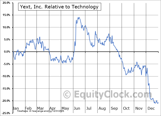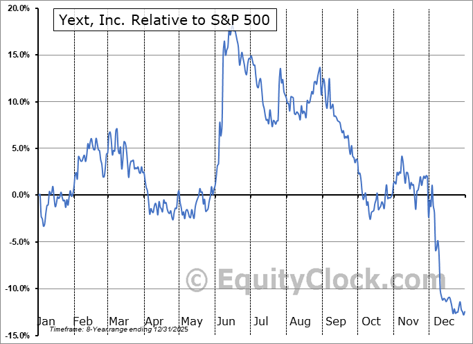 Analysis of the Yext, Inc. (NYSE:YEXT) seasonal charts above shows that a Buy Date of December 11 and a Sell Date of March 1 has resulted in a geometric average return of 5.06% above the benchmark rate of the S&P 500 Total Return Index over the past 7 years. This seasonal timeframe has shown positive results compared to the benchmark in 5 of those periods. This is a good rate of success and the return strongly outperforms the relative buy-and-hold performance of the stock over the past 7 years by an average of 24.35% per year.