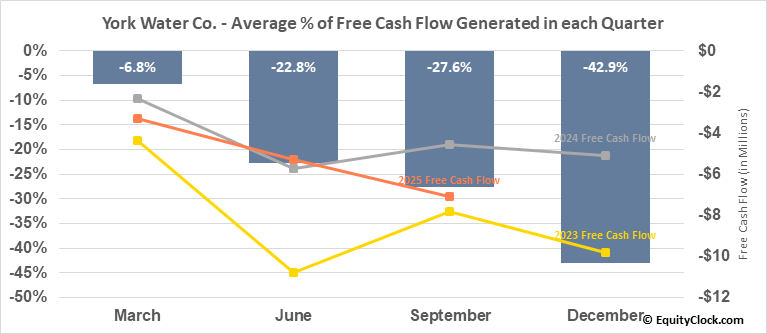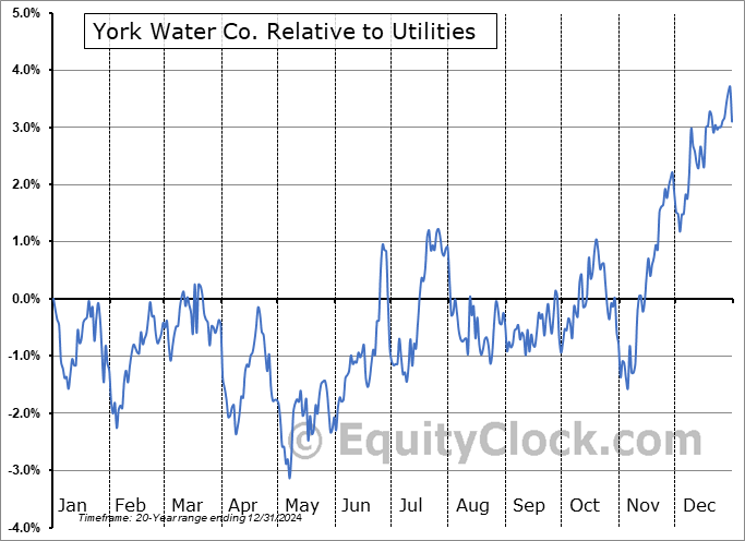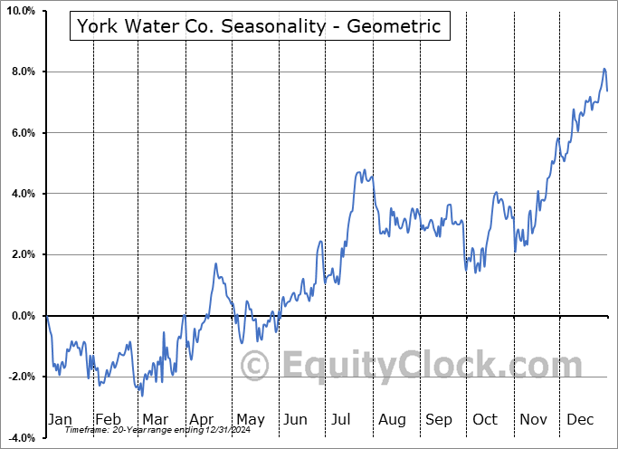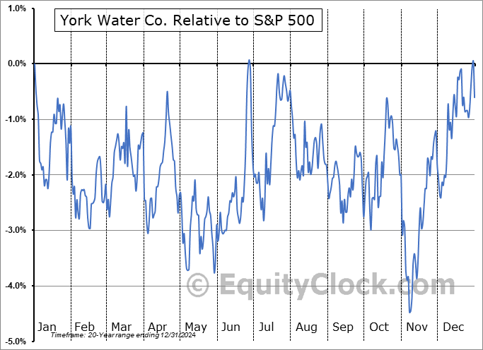 Analysis of the York Water Co. (NASD:YORW) seasonal charts above shows that a Buy Date of May 6 and a Sell Date of July 26 has resulted in a geometric average return of 2.77% above the benchmark rate of the S&P 500 Total Return Index over the past 20 years. This seasonal timeframe has shown positive results compared to the benchmark in 15 of those periods. This is a good rate of success and the return strongly outperforms the relative buy-and-hold performance of the stock over the past 20 years by an average of 5.33% per year.