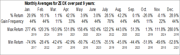 A word of caution: Only 9 years of data is available for shares of ZEOX, perhaps insufficient to create a seasonal profile that accurately gauges the seasonal tendencies influencing the investment. Ideally, while 20 years is preferred, at least 10 years of data is required to perform a seasonal analysis that is considered to be reliable for future seasonal periods.