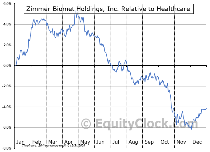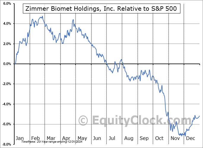 Analysis of the Zimmer Biomet Holdings, Inc. (NYSE:ZBH) seasonal charts above shows that a Buy Date of December 1 and a Sell Date of February 21 has resulted in a geometric average return of 6.11% above the benchmark rate of the S&P 500 Total Return Index over the past 20 years. This seasonal timeframe has shown positive results compared to the benchmark in 19 of those periods. This is an excellent rate of success and the return strongly outperforms the relative buy-and-hold performance of the stock over the past 20 years by an average of 13.54% per year.