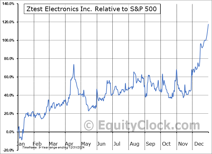 Analysis of the Ztest Electronics Inc. (CSE:ZTE.CA) seasonal charts above shows that a Buy Date of November 22 and a Sell Date of April 18 has resulted in a geometric average return of 74.13% above the benchmark rate of the S&P 500 Total Return Index over the past 9 years. This seasonal timeframe has shown positive results compared to the benchmark in 8 of those periods. This is a very good rate of success and the return strongly outperforms the relative buy-and-hold performance of the stock over the past 9 years by an average of 50.92% per year.