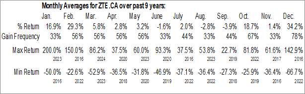 A word of caution: Only 9 years of data is available for shares of ZTE.CA, perhaps insufficient to create a seasonal profile that accurately gauges the seasonal tendencies influencing the investment. Ideally, while 20 years is preferred, at least 10 years of data is required to perform a seasonal analysis that is considered to be reliable for future seasonal periods.